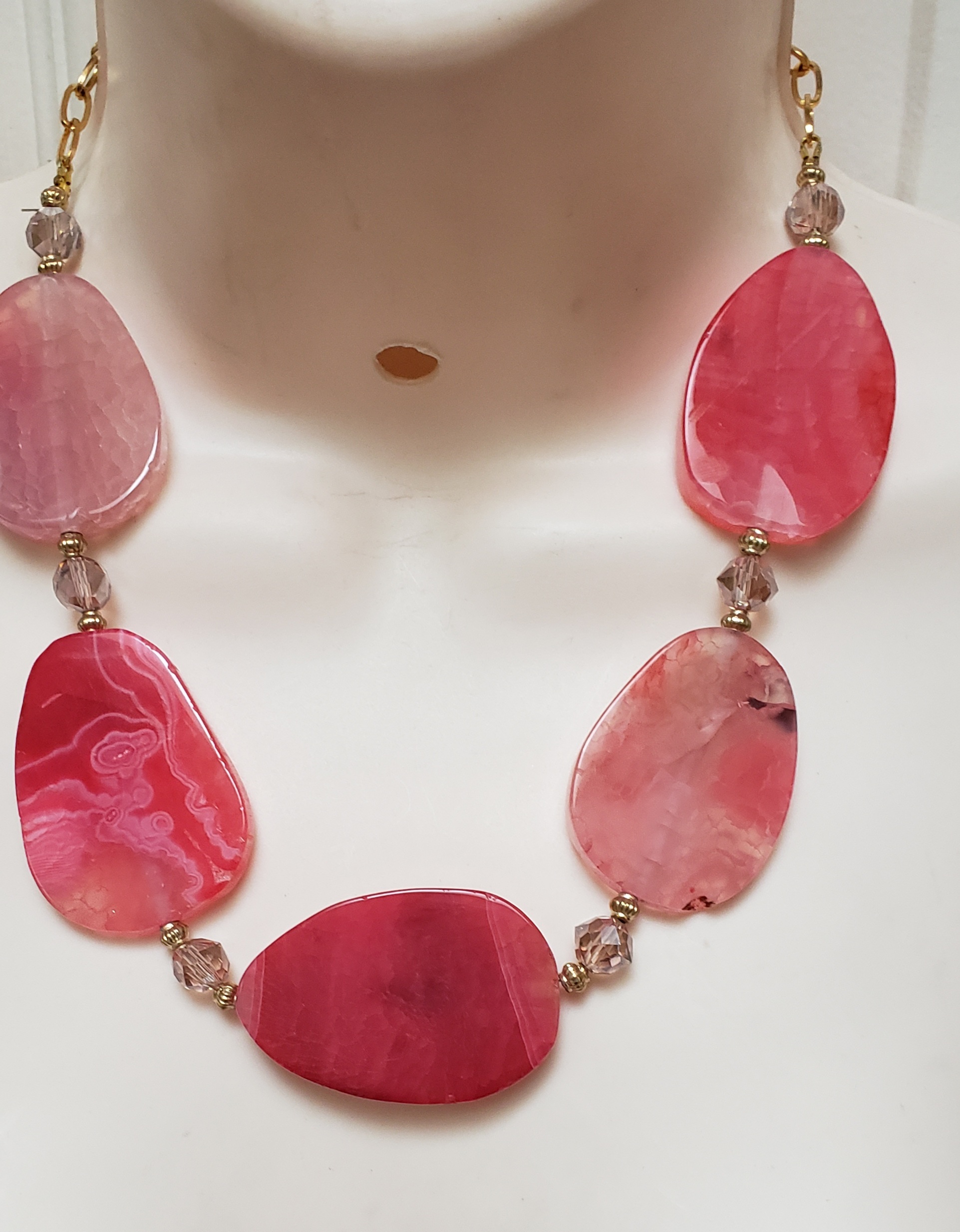 Make a statement with this Cherry Quartz Chunky Gemstone Necklace. Collar beach necklace, gold and crystal accents, 18.5″ long. Hand made by Anne Harris