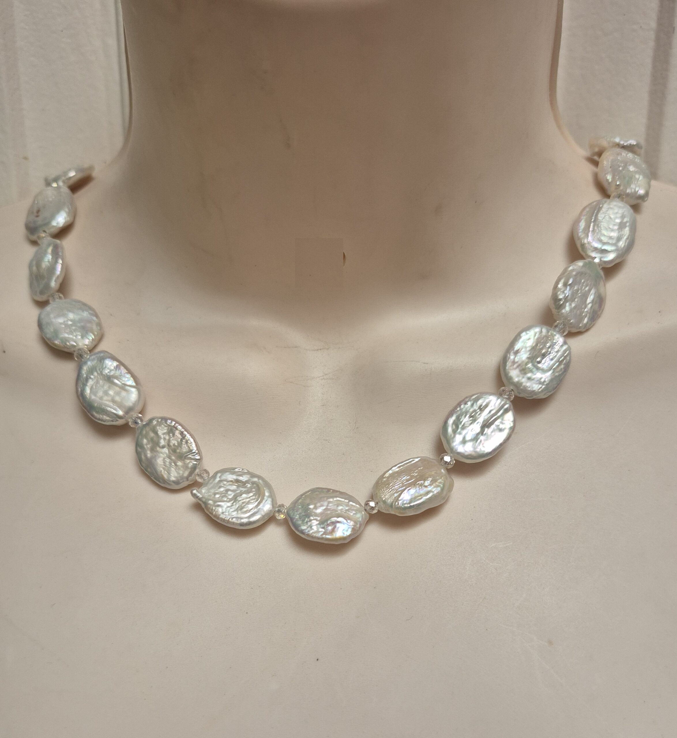 17”ย White Coin Freshwater Cultured Pearl Necklace with crystal accents. A beautiful necklace to accent any attire. Carefully crafted handmade by Anne Harris.