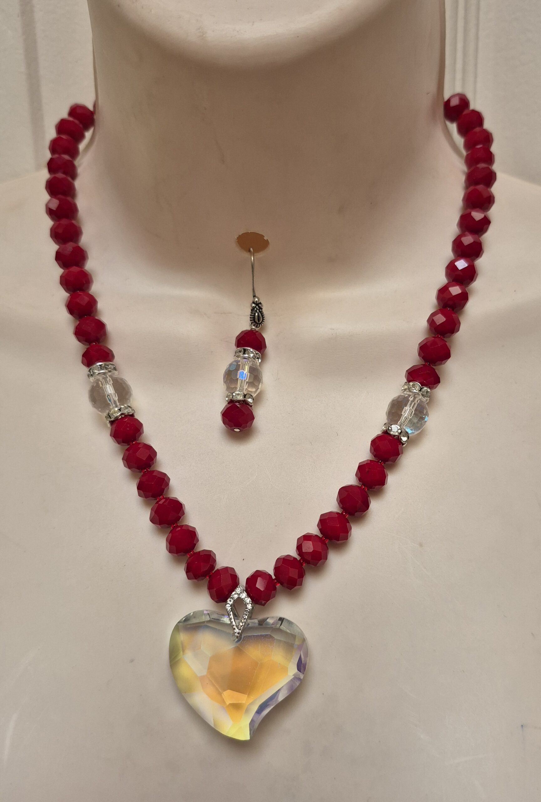 Hot red crystal necklace with glass heart pendant and pierced earring set. The necklace is 18.5 inches long with a silver closure. Handmade by Anne Harris.ย